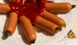 Dita mozzate: mezzi wurstel con unghie di semi di zucca- Pipistrelli: triangoli di pane spalmati di paté di olive nere, con occhi di olive e denti pezzi di formaggio